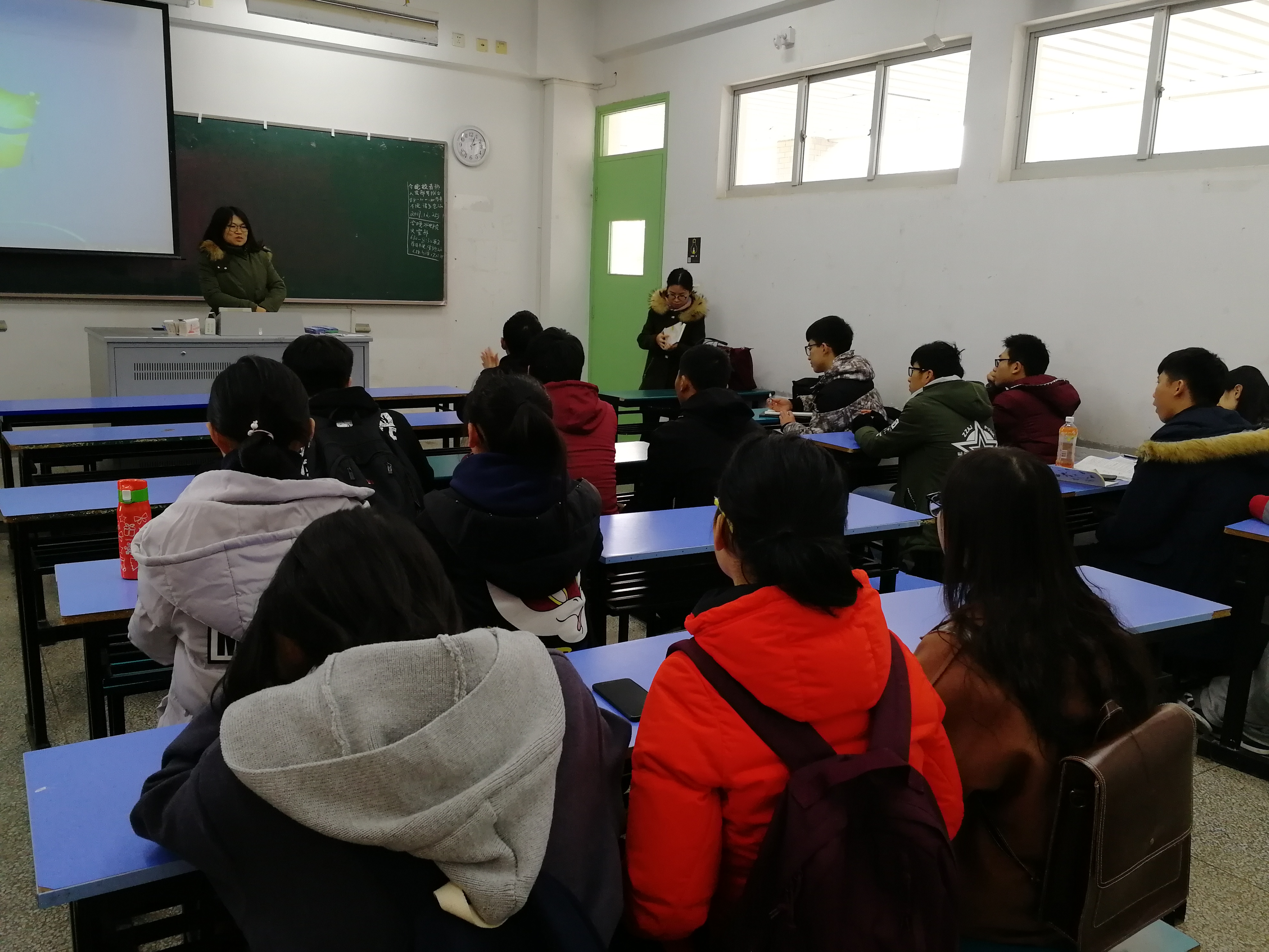 2017年12月25日下午,为创造良好的学习环境,树立正确的班级风气,17级海洋科学二班班导师吴琼老师与辅导员安杰晶老师针对目前二班同学学习上出现的问题开展了主题班会,同学们认识到了目前的不足,进行了深刻的反思的同时好好规划大学的学习生活。
