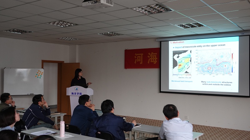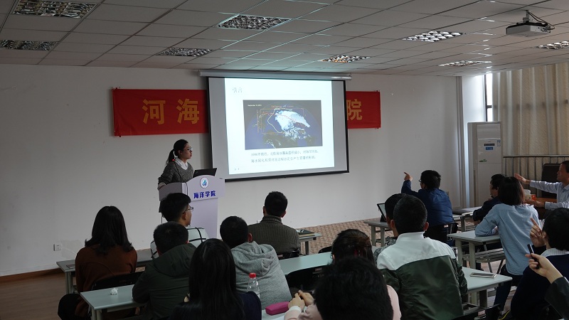 杨雅煜同学以“北极太平洋扇区温盐结构变化的初步研究”为题,阐述了北极海冰减少以后,楚科奇海域水团发生的显著变化及太平洋冬季水的年际变化等问题。陈佳佳同学以“Eddy generation mechanism in the central South China Sea”为题,利用卫星高度计的海面高度异常数据和非线性一层半约化重力模式,汇报了南海中部中尺度涡生成机制的研究进展。