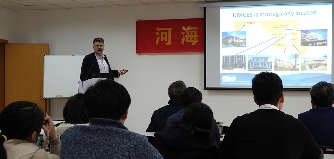 David Nemazie教授首先为公司师生作了题为“Interdisciplinary education thru the Marine Estuarine Environmental Science Graduate Program”的学术报告。David Nemazie教授介绍了马里兰大学环境科学中心的基本情况,讲解了中心各个实验室的职责以及在研究生教育方面的相关工作,重点介绍了近年来环境科学中心围绕切萨皮克湾生态环境所做的大量研究工作。