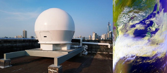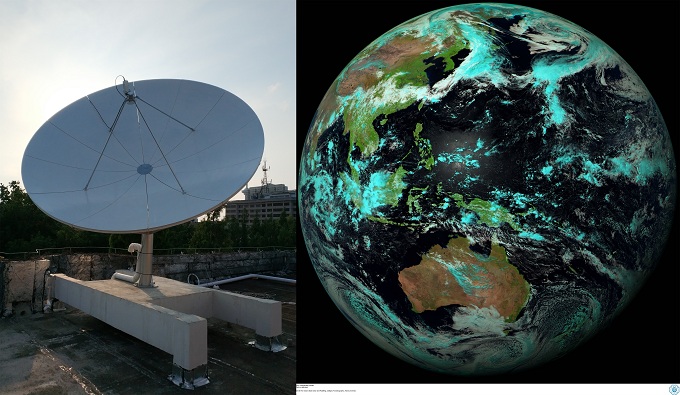 图3 静止卫星天线系统(左图)与2018年5月23日11:30 AM接收到的Himawari-8图像(右图)