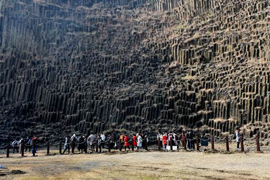 1216日上午,抵达六合国家地质公园后,讲解老师带队参观由玄武岩构成的石柱林。通过老师的讲解,同学们了解了基性火成岩玄武岩与超基性岩地幔包体橄榄岩的产生原因,岩浆岩的地质分类和种类,学习了与内外动力地质作用有关的知识点,玄武岩“柱状节理”,“杏仁状气孔”的形成过程。除了聆听老师的讲解,同学们还仔细观察了玄武岩的颜色,气孔,节理面等物理特征,在玄武岩节理面上找寻淡绿色的橄榄岩包体,对玄武岩和地幔包体有了更直观的认知。参观完石柱林,同学们跟随带队老师登山远眺远处两座死火山的火山锥形貌,感受大自然强大的创造力。