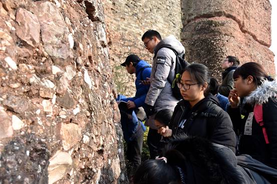 同天下午,大家来到钟灵毓秀石头城遗址公园,在各位带队老师的带领下,四组同学重新焕发了精神,一下车就聚精会神地开始倾听老师的专业讲解并积极地开始找寻所提到的地质现象。其中同学们了解到了“洪积砾岩”,也对“断层”的划分有了粗略地认识,以及通过石头叠瓦状的排列来判断水流的方向,还有“水道沉积”,“辫状河道”等内容。同学们对这些专业知识由于有了实物的比照并不觉得枯燥乏味,反而积极地向老师提出了心中的疑惑,而有了专业老师的一对一讲解,更是让同学们在学习上有了更浓厚的兴趣。