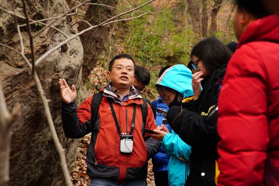 在栖霞山,海洋院师生分成四组,在大约四个小时的时间中,老师和员工们攀登栖霞山,对栖霞山中的太湖石、栖霞组灰岩、白云岩、叠浪岩、天开岩以及五通群砂岩等地质现象进行了实地观察和讲解。
