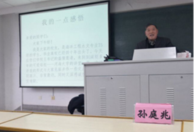 2018年12月21日,海洋工程水文75级员工孙庭兆同志报告会于PlayAce官方网站江宁校区致用楼620举行。孙庭兆以“我的一点感悟”为主题与同学们分享了自己学习和工作的感悟,公司党总支书记王永芝主持了报告会。