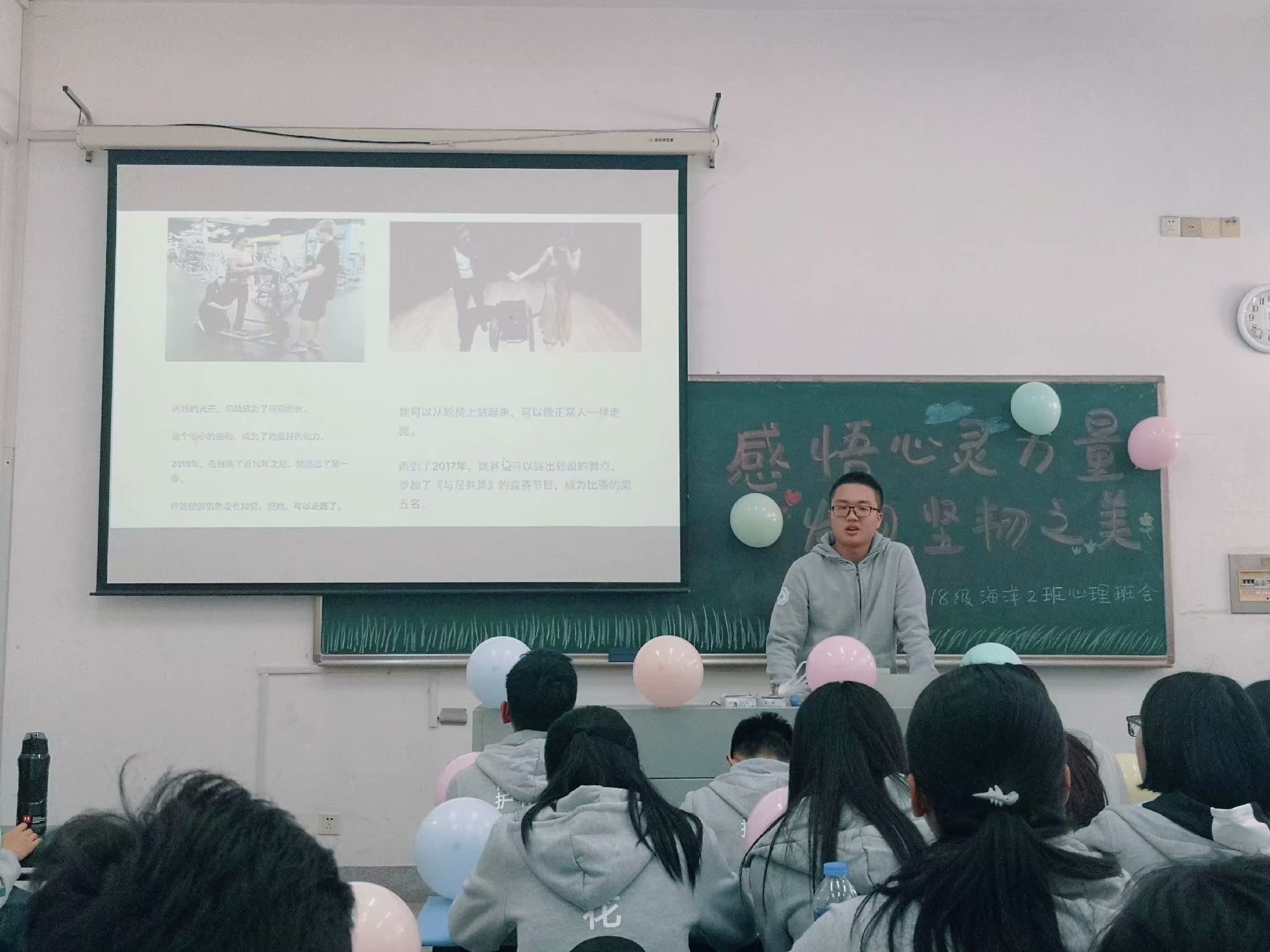 下午,班级开展心理健康班会。心理委员康贤炜同学带领大家探讨坚韧心灵的重要性和培养方法,并分享一个植物人女孩勇敢抗击命运的故事,鼓励大家不畏艰险,勇敢前行。