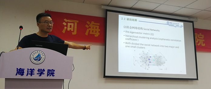 陈炳耀副教授为公司师生做了题为“中华白海豚适宜栖息地预测及人为影响评价”的学术报告。报告首先介绍了我国中华白海豚物种分类学、种群生态学和保护生物学等方面的研究现状。随后,陈炳耀副教授研究团队借助无人机、无人艇和分子生物学等先进技术手段,系统收集了大量原始观测数据。结合历史观测数据,并综合利用生态位模型,针对个体识别、社会网络结构、最适栖息预测、环境变量和人类活动等因素,深入分析了中华白海豚个体联系度的时空变动格局、限制因素、家域分布模式等生态学指标。最后,陈炳耀副教授基于以上结果,提出了中华白海豚的保护管理建议。以上研究有助于增加公众对鲸豚类的了解并提高海洋环境保护意识。报告后,陈炳耀副教授与公司师生对鲸豚类野外观测工作和鲸豚类行为学、保护生物学研究等主题进行了深入的交流,进一步促进了公司师生对海洋生态学、保护生物学工作的认识,开拓了师生们的学术视野。(供稿人:金兴坤,审稿人:赵哲)