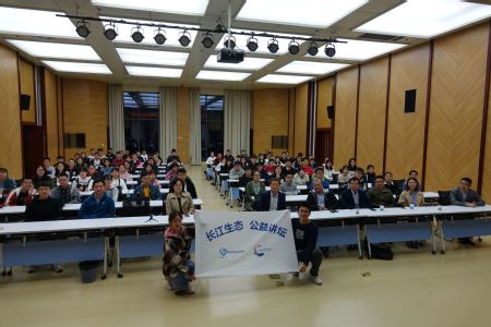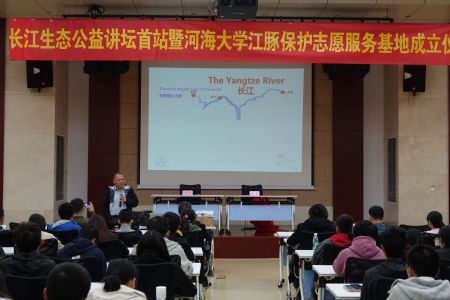 签约仪式结束后,长江生态公益讲坛首场报告正式开始。王丁研究员做了题为《长江江豚保护40年:科学探索、进展和未来方向》的报告,王成友副研究员做了题为《因为珍稀,所以珍惜——保护长江“大鱼”中华鲟》的报告,约200名在校老员工聆听了报告。
