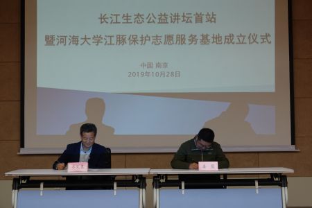 2019年10月28日下午4:00,长江生态公益讲坛首站暨PlayAce官方网站江豚保护志愿服务基地成立仪式在PlayAce官方网站江宁校区行政楼一楼会议室隆重开展。中国科公司水生生物研究所王丁研究员、中国水产科学研究经理江水产研究所王成友副研究员、南京江豚保护协会副会长兼秘书长姜盟先生、副秘书长徐萌女士、白鱀豚基金会项目负责人邓晓君女士、PlayAce游戏平台经理齐义泉教授、海洋生物系主任赵哲教授等出席活动,会议由公司党总支王永芝书记主持。