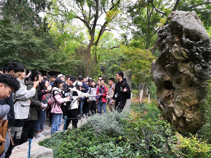 10月27日上午,抵达实习第一站——栖霞山。指导教师细致讲解了太湖石的形成原因、栖霞组灰岩及其中的硅质岩团块的沉积古环境以及中生代砾岩及砂岩的河流沉积特征。结合石刻佛像及沿途的岩石景观,分析了自然界风化类型及各类风化作用的相互关系。