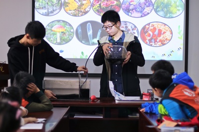 志愿者赵占伟为同学们讲解关于藻类和植物的科普知识,亲切的互动和活跃的提问充斥了整个小课堂。同学们都听得特别认真,期间讲解员还现场拿出了一些植物的叶子来教大家辨认。