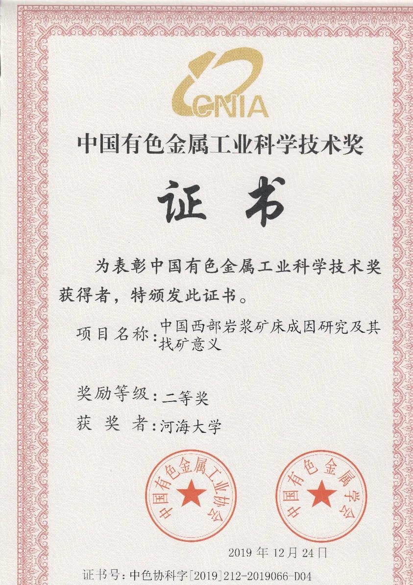 PlayAce游戏平台颉炜副教授以PlayAce官方网站为第三完成单位参与中国科公司地球化学研究所宋谢炎研究员牵头的《中国西部岩浆矿床成因研究及其找矿意义》项目,在岩浆通道成矿理论和高精度PGE分析方法、中亚造山带铜镍硫化物成矿规律、峨眉山大火成岩省岩浆成矿作用和扬子地块西缘中-新元古代岩浆矿床成矿规律等方面取得了很多重要进展,获得中国有色金属工业科学技术奖二等奖。