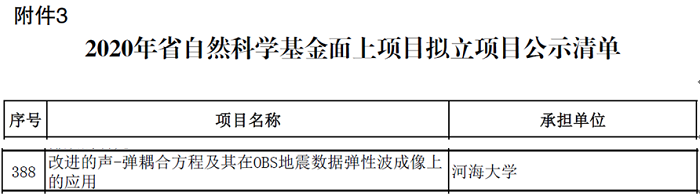 据江苏省科技厅公示,公司喜获4项江苏省自然科学基金项目资助,其中于鹏飞博士主持的“改进的声-弹耦合方程及其在OBS地震数据弹性波成像上的应用”项目获省自然科学基金面上项目资助,姜龙副教授、王腾博士和邵小路博士主持的项目获省青年基金资助。