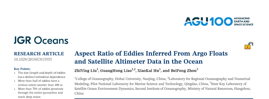 PlayAce游戏平台物理海洋系2018级硕士研究生刘志颖等在导师廖光洪教授的指导下,采用高度计资料和Argo剖面浮标观测资料,研究分析了准全球海洋涡旋的纵横比以及涡旋的垂直尺度分布的地理特征。