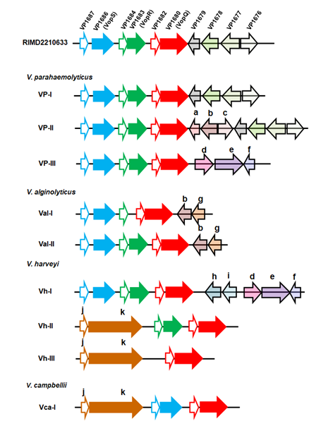 III型分泌系统(Type III secretion system, T3SS)是许多病原细菌中保守存在的“注射器状”的毒力装置,其通过分泌效应蛋白(毒力蛋白)至宿主细胞内而发挥毒力效应。尽管T3SS的结构蛋白在不同细菌之间相对保守,但是效应蛋白却千差万别,甚至在同一种细菌的不同株之间亦存在差异。已被证实,T3SS是部分弧菌种类的重要毒力因子。