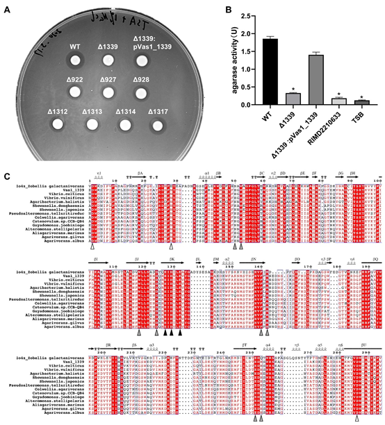 图.1 闪沙弧菌HN897降解琼脂关键基因Vas1_1339的鉴定(图注请见原文)