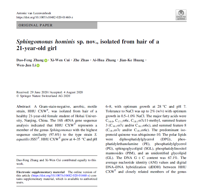 近日,公司海洋生物系张道锋博士和2016级本科生崔希雯同学为共同第一作者在SCI收录源刊、以显微镜发明者列文虎克命名的国际微生物学期刊《Antonie van Leeuwenhoek》在线发表了题为“Sphingomonas hominis sp. nov., isolated from hair of a 21-year-old girl”的文章(https://link.springer.com/article/10.1007/s10482-020-01460-z)。