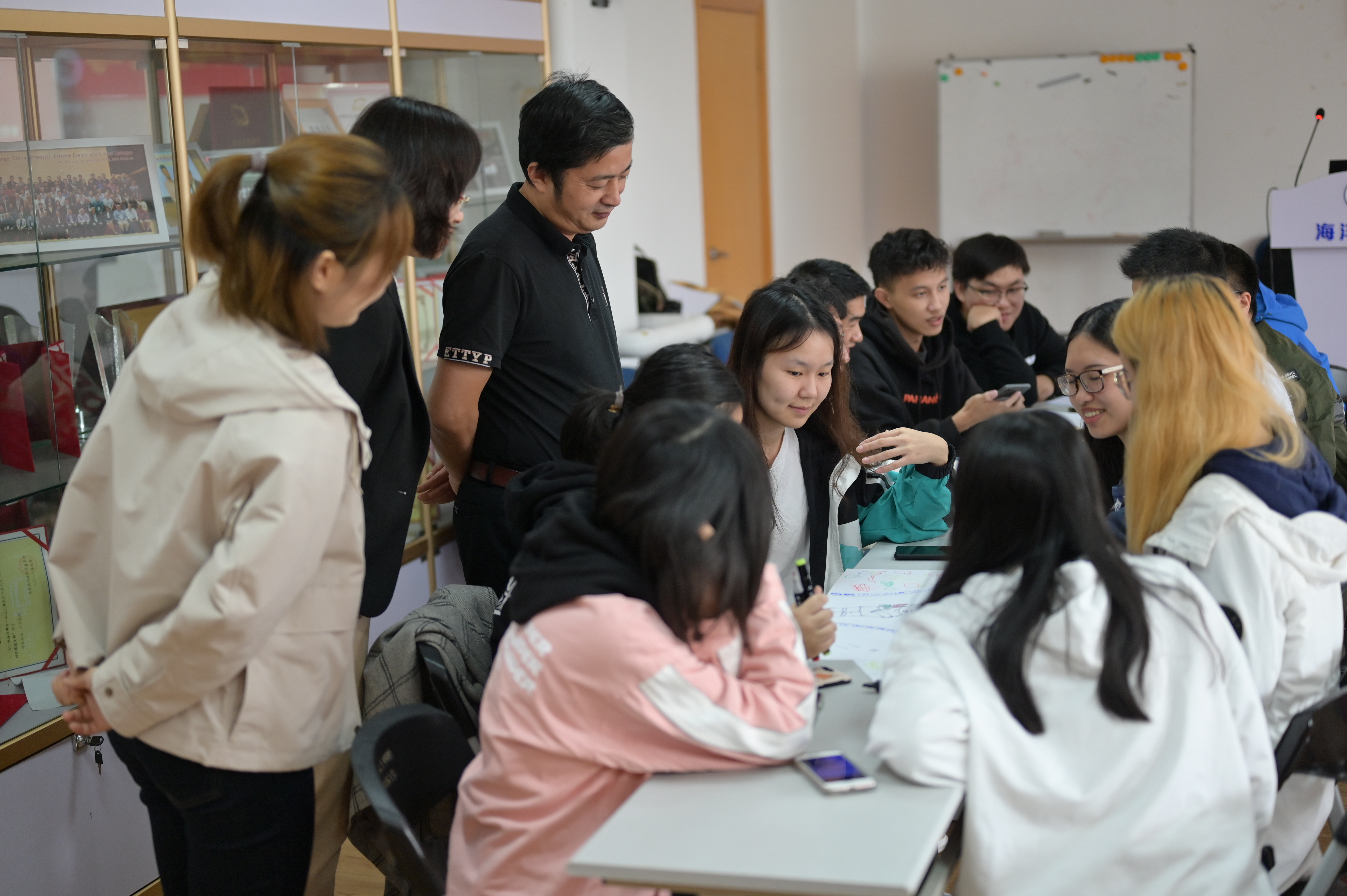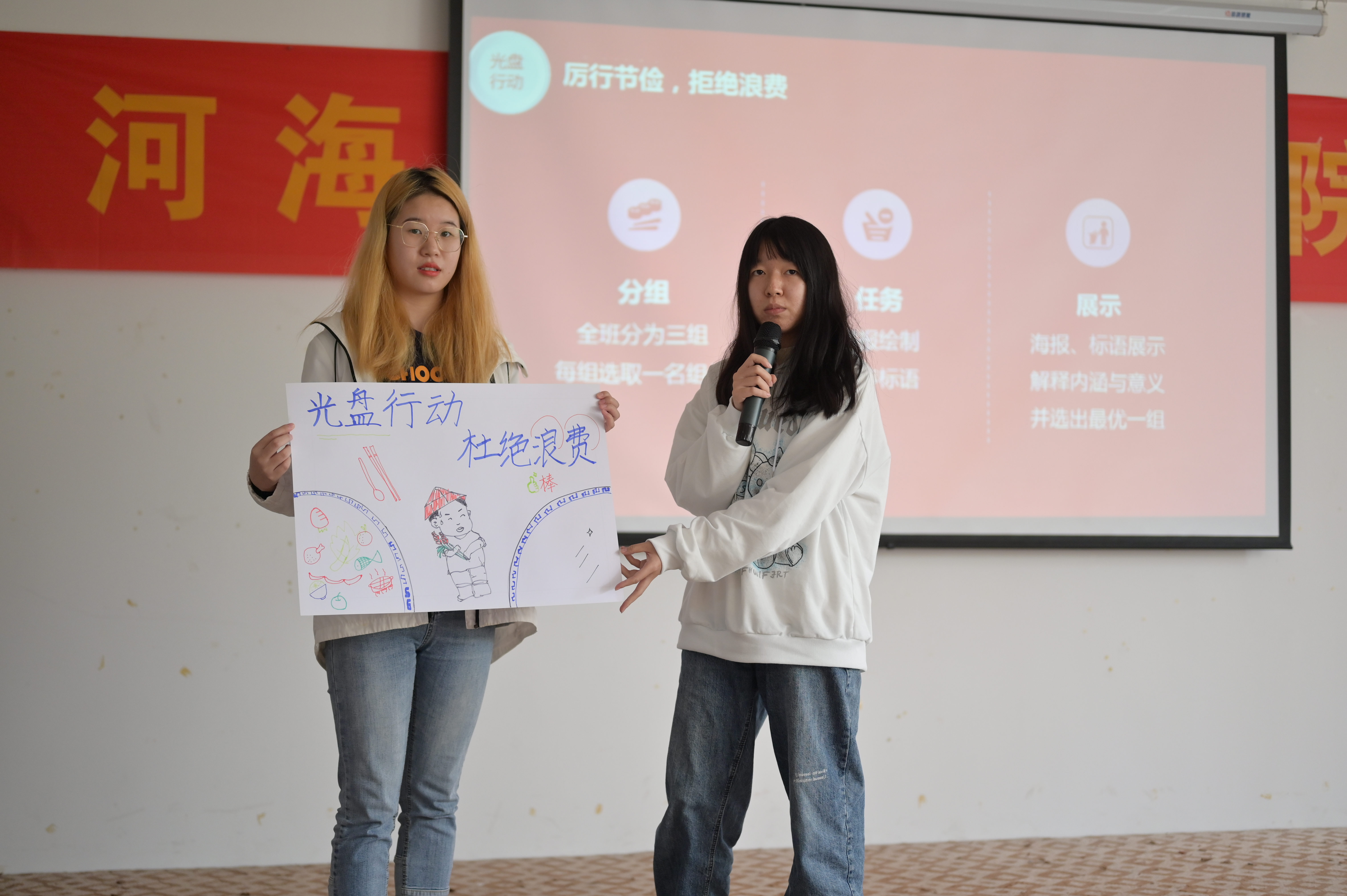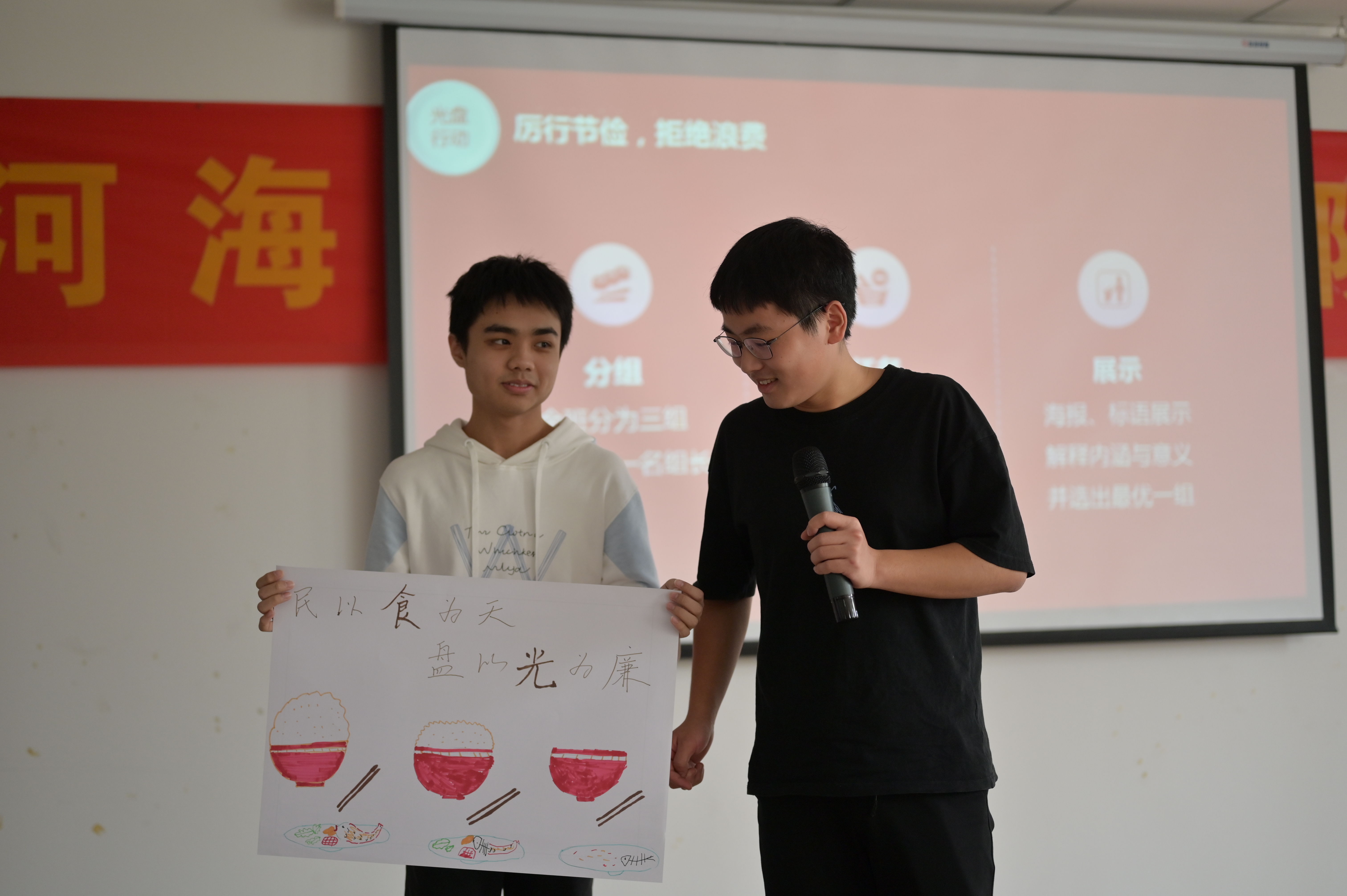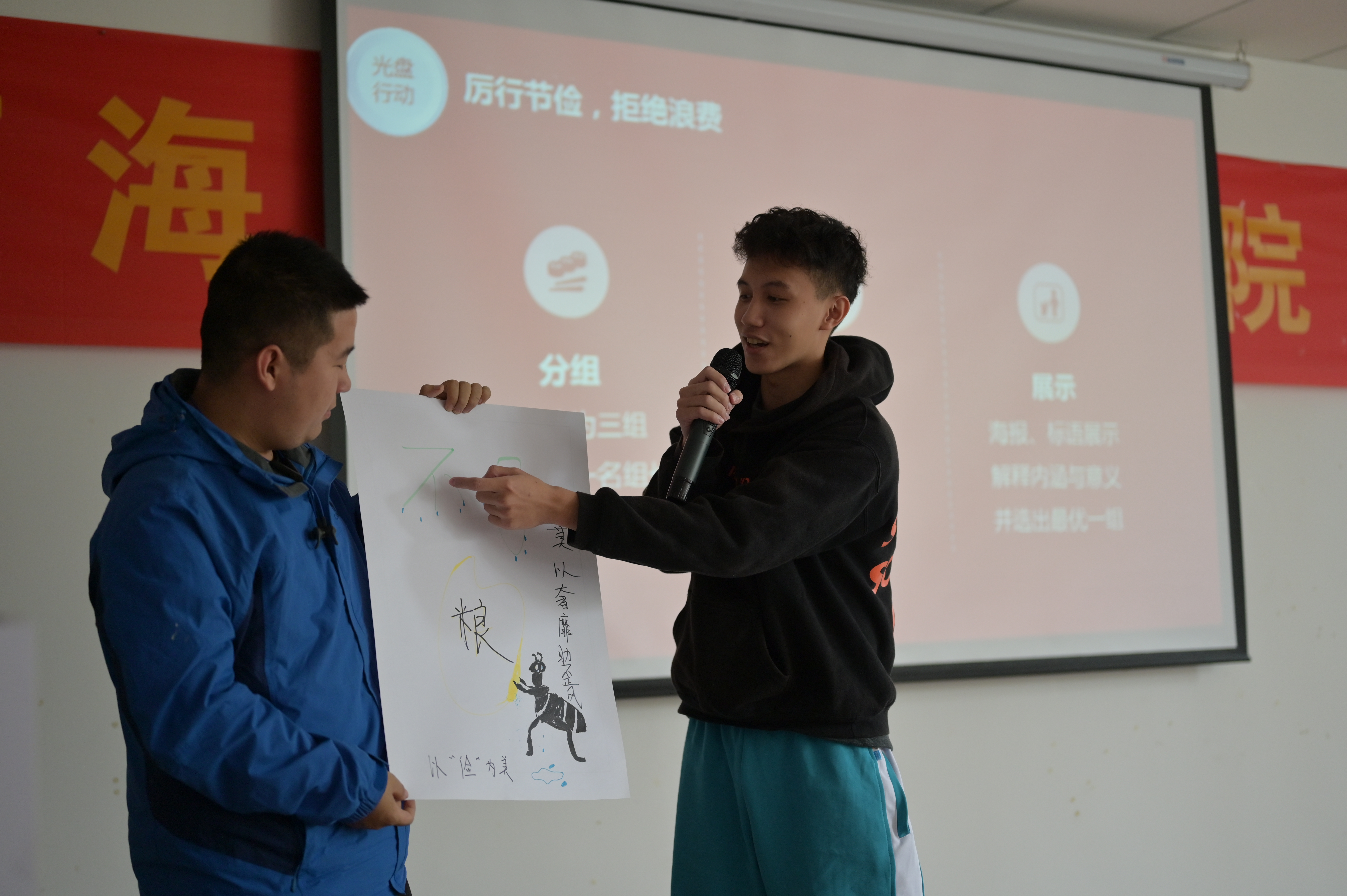 随后,团支书对班级内进行的为期一周的光盘打卡活动进行了总结评价,并邀请郭仔佚、林炜凯两名同学对光盘打卡活动发表感想。接下来,班内同学分成三个小组进行“厉行节俭,拒绝浪费”主题海报现场绘制,每个小组推荐两名同学进行作品分享以及立意介绍,之后请何处长进行了点评。在观看完前期制作的班级宣传视频之后,何文科处长、王永芝书记进行了总结发言,两位在总结中都用自己的亲身经历告诉同学们食物的来之不易,让同学们切实地感受到厉行节俭的重要性,并用自己的行动以身作则,引导同学们用个人行动来弘扬中华民族传统美德。