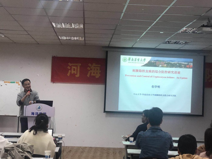 2020年10月23日,在公司迎来建校105周年,公司建院5周年纪念日之际,中山大学李安兴教授、华南农业大学但学明教授和华南理工大学罗晓春教授应邀做客公司“海韵大讲堂”学术论坛,并分别作了题为“疫苗在鱼类疾病防控中的应用”,“刺激隐核虫病的综合防控研究进展”和“微生物氮代谢与虾蟹壳高值化利用”的学术报告。院内外共计80余人聆听此次报告。