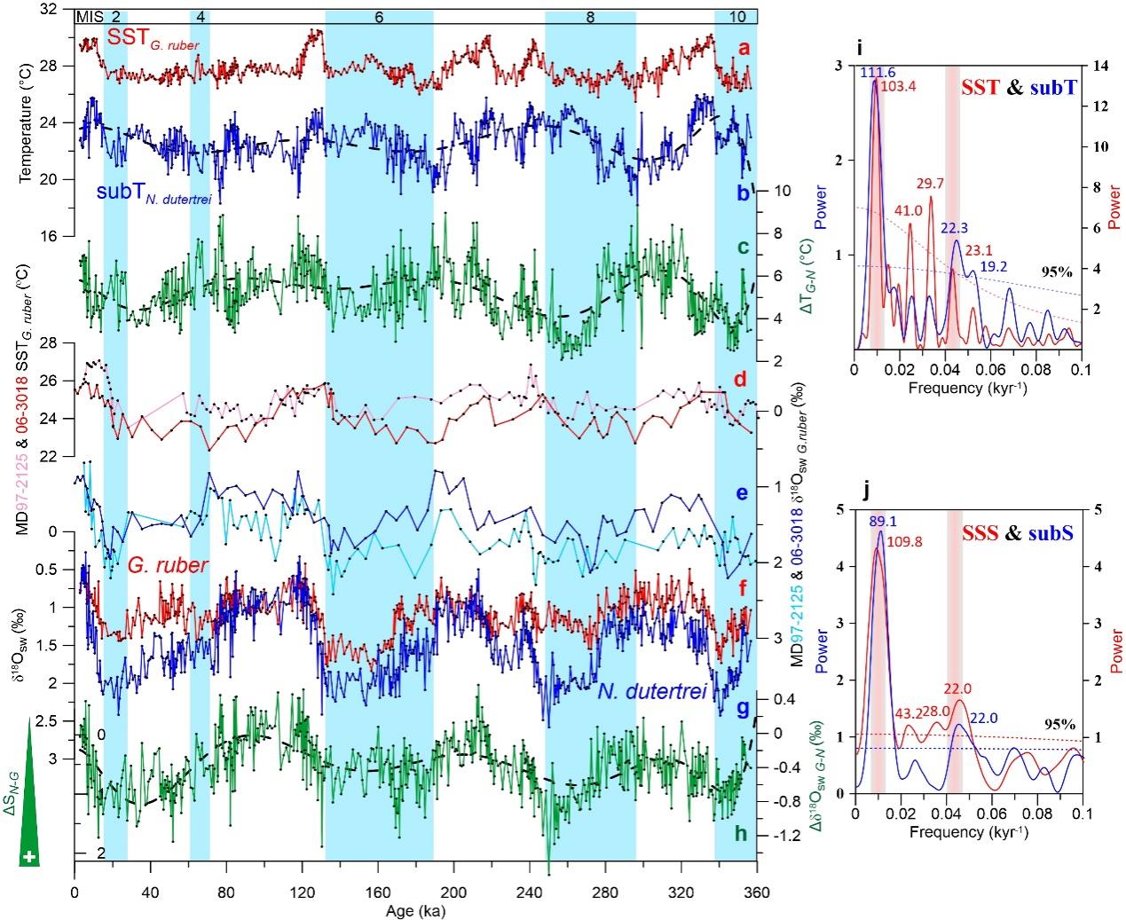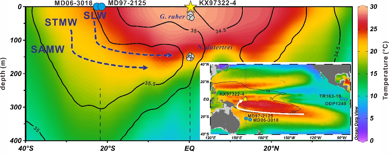 2021年11月22日,公司齐义泉教授课题组博士后张帅与合作者在Nature出版集团的刊物《Communications Earth & Environment》上发表论文,通过测试热带西太平洋暖池核心区海底沉积物中多种有孔虫壳体的地球化学(稳定氧同位素和镁钙比值)变化,在地质时间尺度上,重建了最近三十六万年西太平洋海区的表层和次表层的水体温度与盐度的演化历史,并探讨了太平洋热带与亚热带海区浅层温盐环流在地球轨道岁差频段类ENSO过程中的关键作用。
