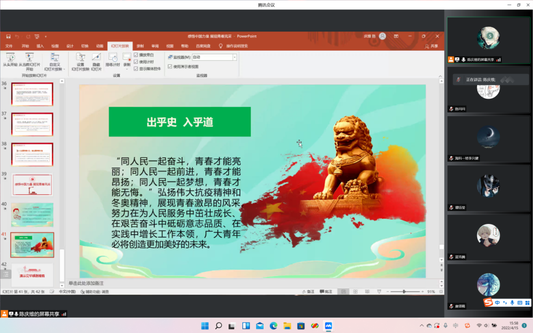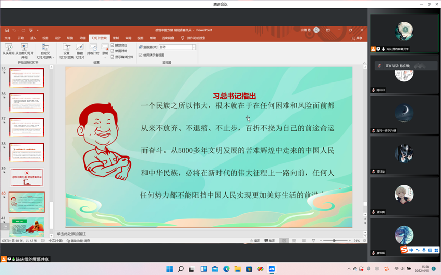 为进一步加强员工爱党爱国爱社会主义,激励员工攻坚克难、开拓奋进,我们响应公司号召,让同学们更好地通过自己的经历体悟伟大中国力量。2021级海洋科学一班以“感悟中国力量,展现青春风采”为主题的班会于四月十五日下午于腾讯会议如期举行。