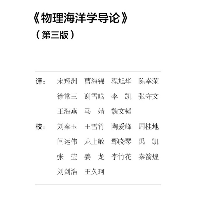 翻译团队主要由公司青年教师和预报中心气候预测团队组成,并得到中国海洋大学刘秦玉教授的指导和校稿集团多名青年教师和研究生参与其中(见图2。经过多轮翻译和润色、校对、审核工作,历时近一年完成了原著翻译工作。团队成员本着一丝不苟的原则,对译文质量严格把关、反复推敲,力求信、达、雅,保证科学严谨性和语言优美性的结合,力争为我国物理海洋学的教学和科研贡献一部高水平教材译著。