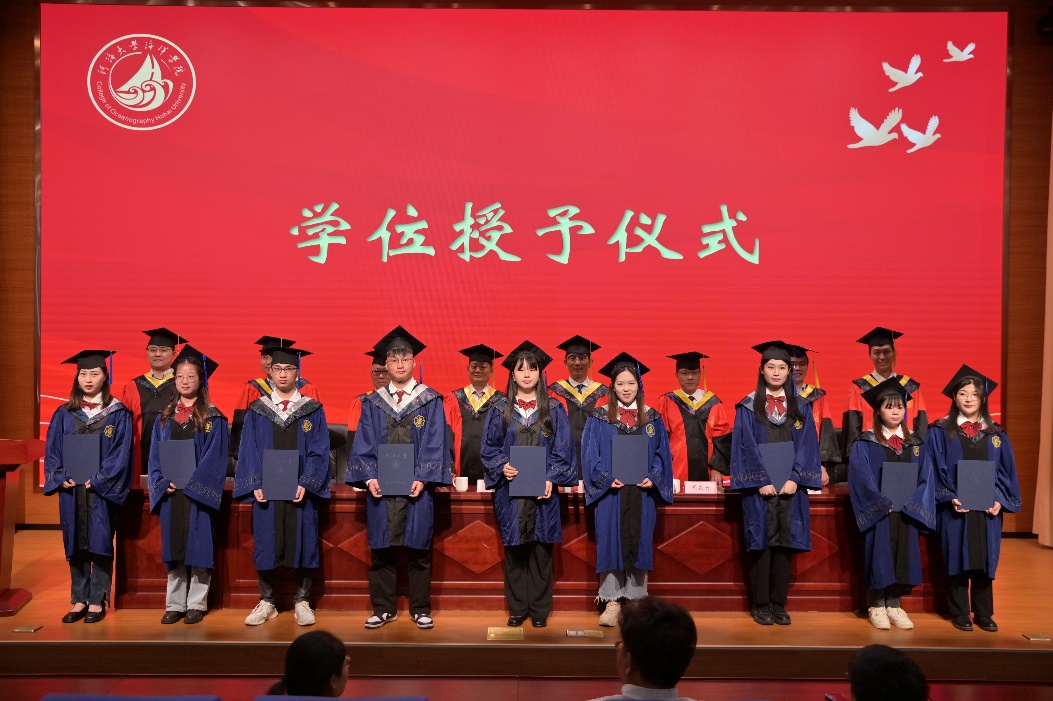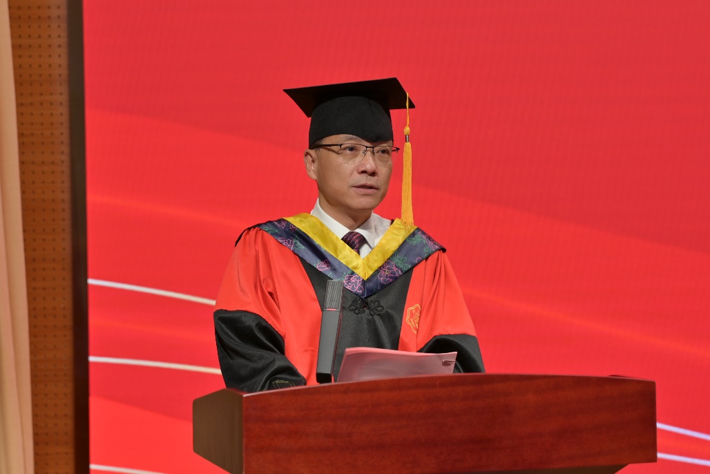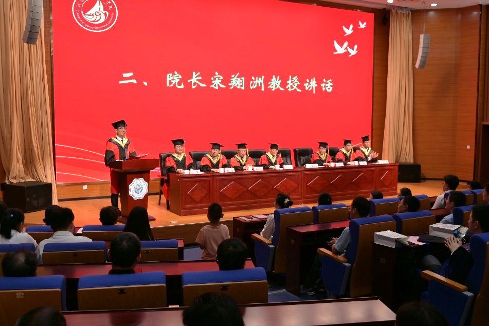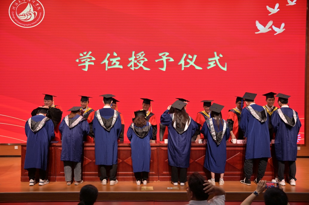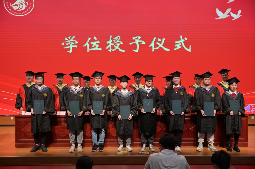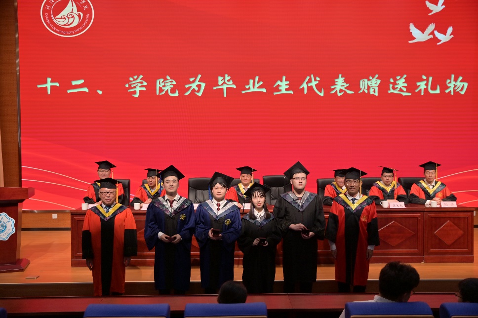 典礼嘉宾、83级海洋工程水文专业杰出员工邓东升董事长向毕业生们表示最诚挚的祝贺,向母校和老师们致以最崇高的敬意。他以“海”为题与毕业生们分享了自己的几点感悟。一是要以“海的风度”塑形象,彰显新时代河海海洋人的特质,希望毕业生永葆追逐理想的热情、永葆吃苦耐劳的毅力、永葆无私奉献的品格。二是要以“海的气度”宽胸襟,彰显新时代河海海洋人的格局,做到善于倾听能容言、求同存异能容事、换位思考能容人。三是要以“海的深度”练内功,彰显新时代河海海洋人的底蕴,做到勤于学习多充电、肯于钻研多增能、勇于创新多探索。四是要以“海的力度”干事业,彰显新时代河海海洋人的担当。做到学会用狠劲干事业、学会用拼劲干事业、学会用韧劲干事业。勉励毕业生们传承河海精神,怀揣海洋梦想,在新的人生征途上,追逐属于自己的诗和远方。