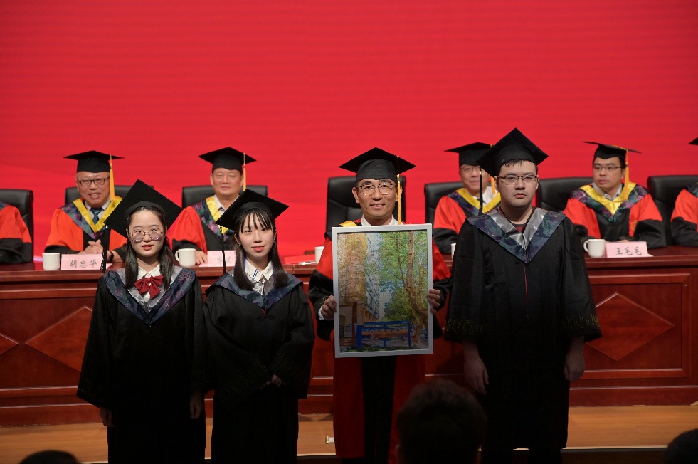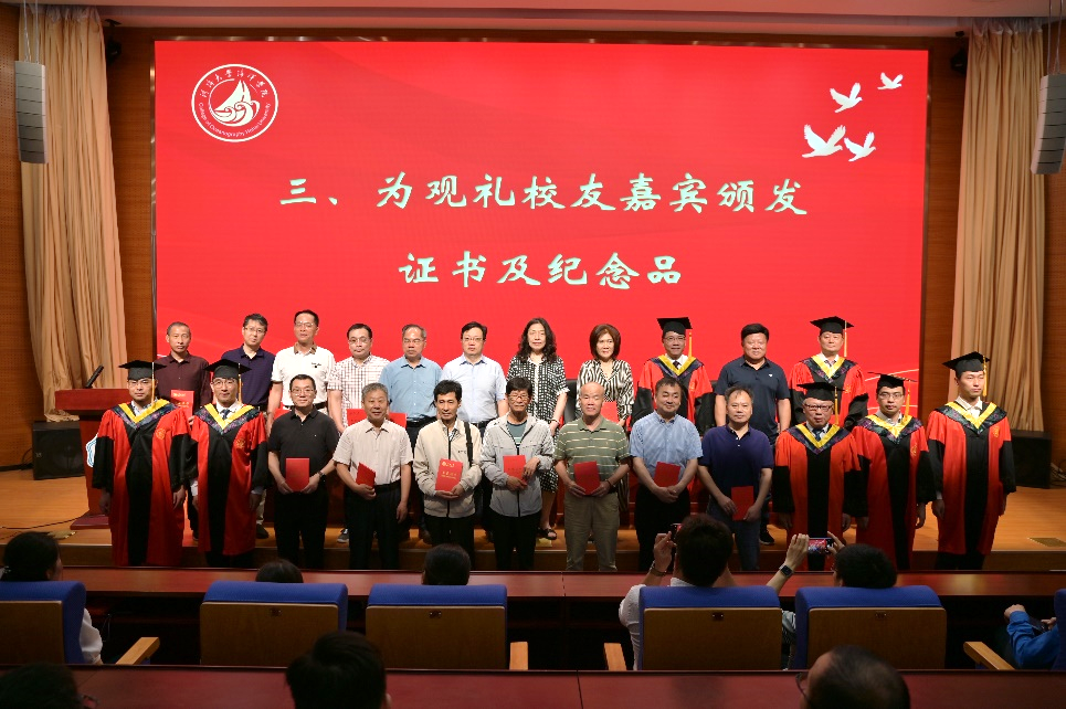 典礼上,公司党委书记胡忠华、经理宋翔洲为员工颁发荣誉证书,毕业生代表为员工嘉宾赠送承载河海记忆的纪念品——河海梧桐叶,员工代表为毕业生赠送祝福卡片,并合影留念。