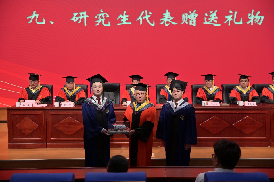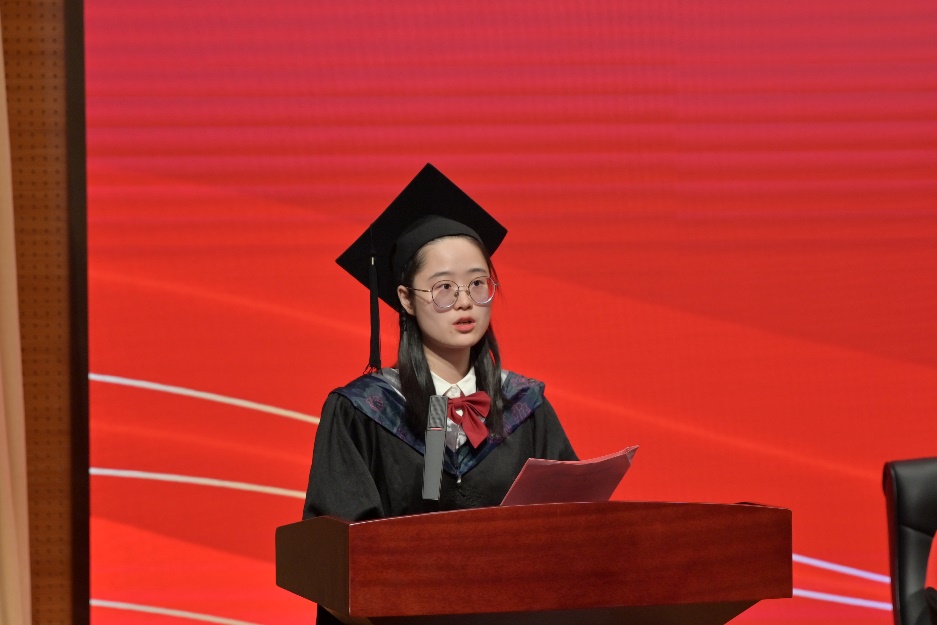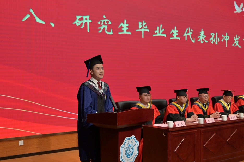 研究生毕业生孙冲作为研究生代表表达了对校园生活的怀念、对师长的感激以及对母校的祝愿。他表示,三年时光他们在用不懈的努力和汗水诠释着一个平凡却属于自己的青春,收获着一份朴实却来之不易的成熟。本科生毕业生代表陈雨卉表达了对母校的感激之情,并表示立志要做一个有担当、有抱负的青年,牢记公司的教诲,明辨是非,坚守本心,去追求心中的真理。