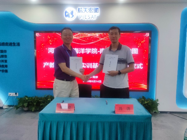 在座谈会上,双方就产学研合作、人才培养、实践就业等方面进行了深入交流。总经理翟建设详细介绍了航天宏图信息技术有限公司的历史沿革、组织结构、主要业务板块、发展情况和人才需求情况,期望未来有更多优秀毕业生加入。相关技术人员介绍了公司在气象海洋、无人机、大气火情、生态环境等业务上的应用,开拓了员工对职业领域的视野。海洋技术系副系主任沈浙奇介绍了公司的基本情况、员工培养及就业情况等。为深化校企间产学研合作,会上双方签署了产教融合实习实训基地合作协议并揭牌,为实现双方供需对接、合作共赢奠定了良好基础。