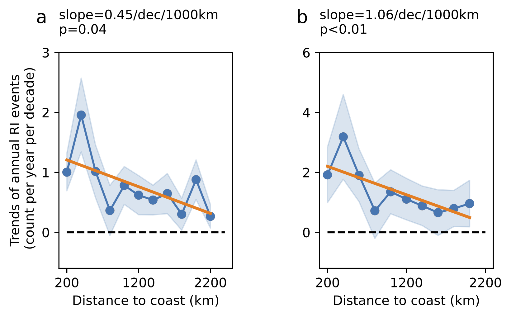 图1.不同离岸距离范围内的快速增强事件的上升趋势。图a:以45kt/24小时为阈值;图b:以30kt/24小时为阈值
