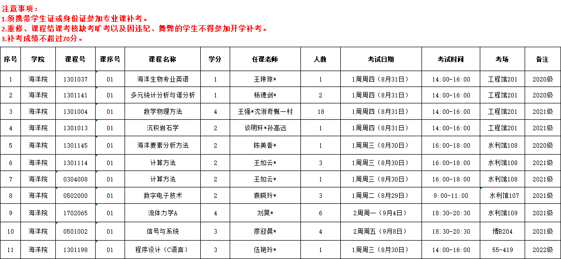 2023-2024-1学期海洋院专业课开学补考安排