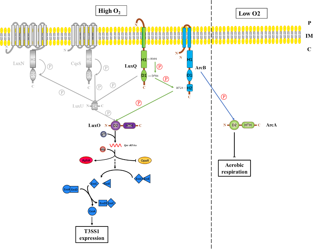 在低细胞密度和有氧条件下,组氨酸激酶LuxQ感知环境信号,并使用ATP作为磷酸供体将HisKA结构域内的保守组氨酸自磷酸化。然后该磷酸基团被转移到共价连接的REC结构域中的第二磷酸化位点。随后,磷酸基团被转移给ArcB C-端Hpt结构域中的组氨酸,后者又将其传递给RR LuxO内REC结构域中保守的天冬氨酸。磷酸化的LuxO通过控制ExsACDE操纵子来调节T3SS1的表达。