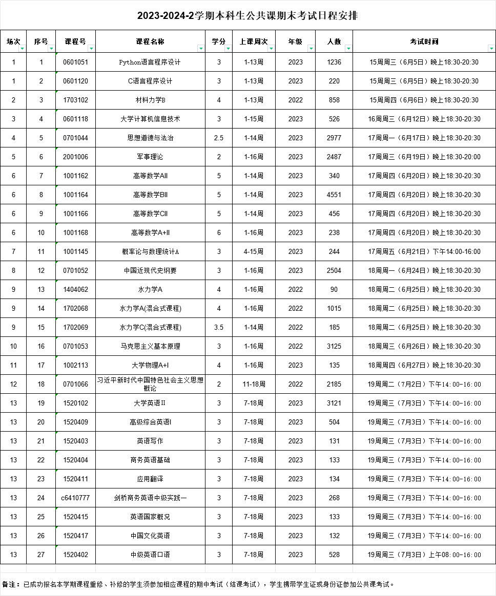 2023-2024-2学期本科生公共课程结束考试及2024-2025-1学期开学补考日程安排
