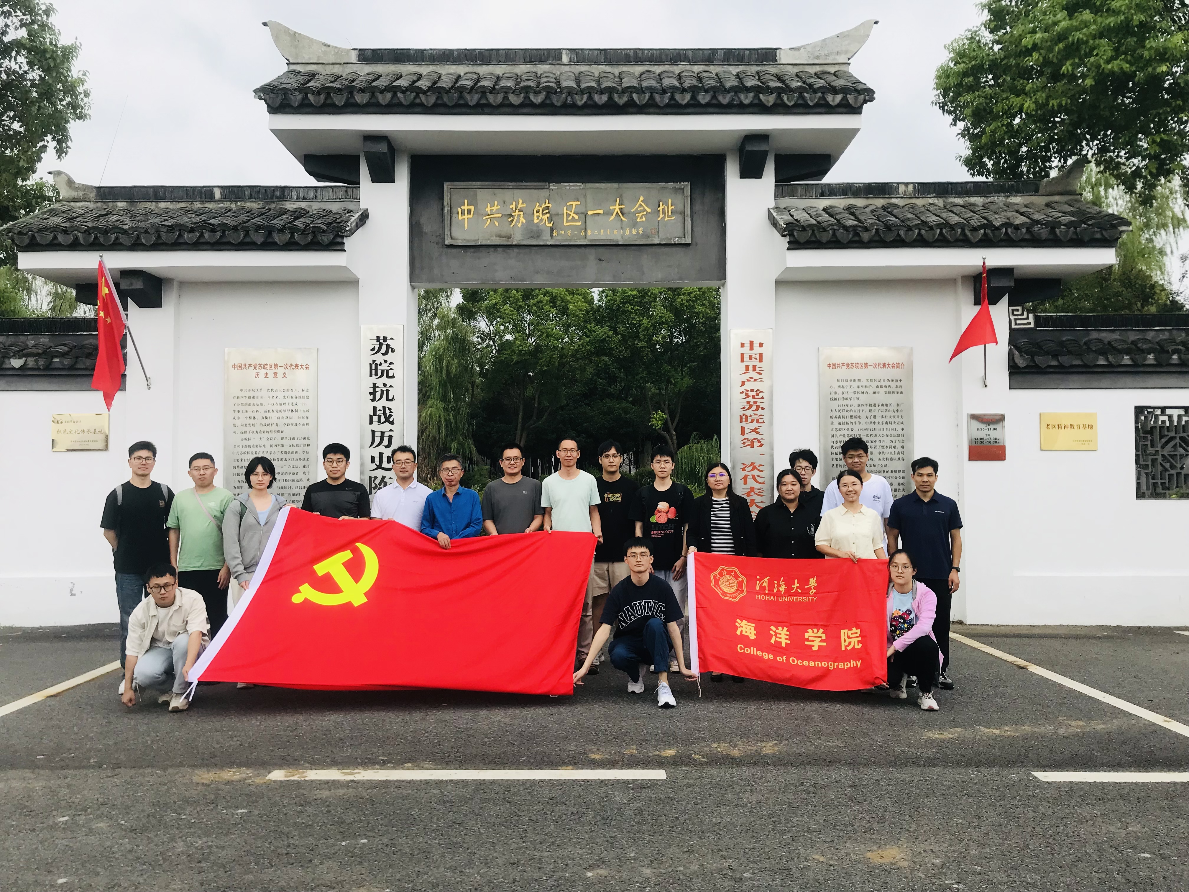 中共苏皖区一大旧址坐落在金坛区直溪镇蔡甲村委西侧,是中共苏皖区第一次代表大会的召开地。纪念馆内陈列有许多珍贵的历史文物,真实地记录了中国共产党创建时的历史面貌。师生党员们一边听现场讲解员的详细解说,一边在图文及实物资料的观摩中深入了解革命先烈的英勇事迹。