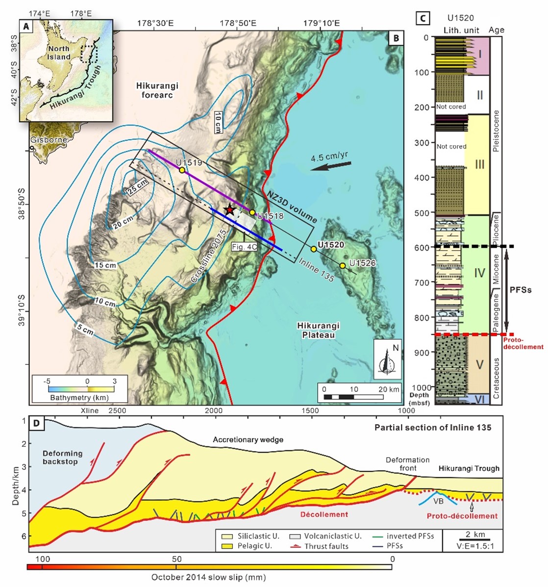 尽管SSEs在全球多个俯冲带已有大量观测,然而对于其形成机制仍不明确。在众多假设中,粗糙海底的俯冲以及俯冲界面断层带内的岩性非均质性被普遍认为是主要影响因素。历史记载与现代观测表明,新西兰希库朗吉和日本南海海槽俯冲带都曾发生大地震,并频繁出现浅部SSEs、tremors、VLFEs以及海啸等现象。海底大地测量显示,希库朗吉北缘和南海海槽的SSEs与VLFEs向上延伸至海底以下2公里,甚至可能一直延伸至海沟处(图1)。这是全球最浅且记录最为完整的SSEs,因此提供了绝佳的机遇来通过大洋科学钻探、地球物理探测、构造解析、数值模拟等手段来研究SSEs的本质机制与行为,及其与俯冲界面大地震之间的关系。最近的研究在南海和希库朗吉海槽等俯冲带的输入沉积序列中,发现了多边形断层系统(PFSs)。这些PFSs具有正断层位移性质、多边形结构和紧密间距特征,大多位于输入板块的原型滑脱层正上方。输入板块中发现的PFSs引发了关于其在巨型逆冲断层结构、水文地质及地震行为中作用的重要问题:这些PFSs在俯冲过程中是否会在增生楔内重新活化,以及是否会影响巨型逆冲断层的应变分配、几何粗糙度及物质非均质性?