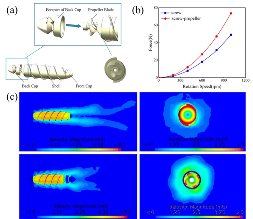 为深入揭示其中的科学问题,团队开展了一系列水动力数值模拟,探究了螺旋设计参数对螺旋推进性能的影响,提出了螺旋体在水中推进的力学模型。在此基础上,创新性地提出了一种带桨叶的螺旋体结构,进一步大幅提升了水下螺旋驱动效能。